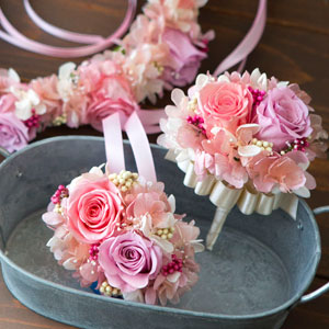 | 春色パステルカラーのリストレット | アンティークホワイトとエバーグリーンの花冠 小物 | ピンク・パープルローズのナチュラル花冠 小物 |