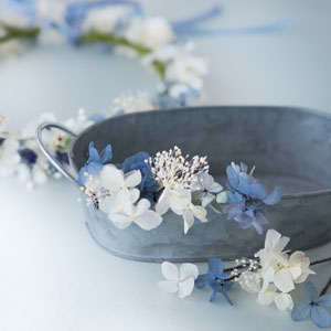 デザイナーこだわりの特別なロイヤルブルー。 同じ型番の同じ色名でも、入荷の時期によって色も大きさもバラバラ。 入荷したての鮮やかな色より、少しくすんだ方が雰囲気が出るお色もあります。 良い状態のロイヤルブルーの色にこだわり、見せ方にこだわった1点ものです。 入荷の時期によってはお作りできない場合もあります。 ラベンダーの香る花冠。かすみ草をランダムに散らして華やかに。 花嫁がつけると幸せになれるというサムシングブルーをプラス。 プリザーブドフラワーなので、ヘアメイクリハーサルや撮影用に、またはお式が終わっても柔らかな質感を長くお楽しみ頂けます。 |